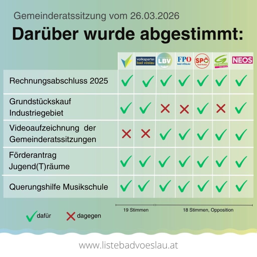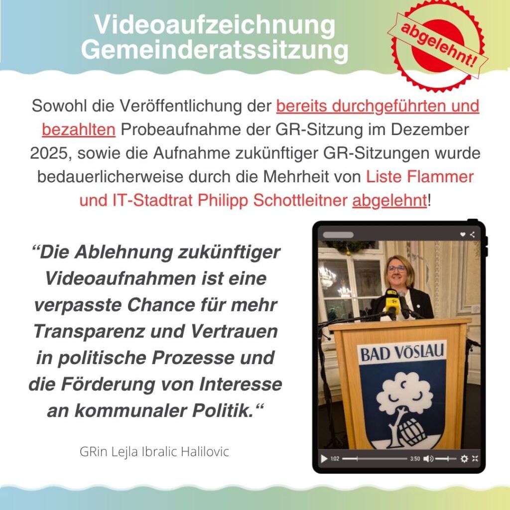 „Es ist bedauerlich, dass sich im Gemeinderat keine Mehrheit für die Veröffentlichung fand. Alle Oppositionsfraktionen haben sich klar für eine Durchführung der Videoübertragung positioniert. Die Liste Flammer spricht sich unter dem Vorwand von möglichen rechtlichen Bedenken (die die Liste Bad Vöslau nicht teilt) gegen die Einführung einer Videoübertragung aus. Dies ist eine verpasste Chance für mehr Transparenz, Bürgernähe & barrierefreie Teilhabe an der Kommunalpolitik!“