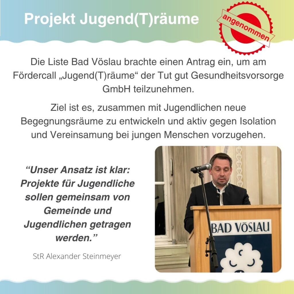 Mit dem Projekt „Jugend(T)Räume“, das vom Fonds Gesundes Österreich finanziell unterstützt wird, setzt „Tut gut!“ aktiv eine Initiative zur Unterstützung der Jugendlichen. Ziel des Projektes ist es, soziale Isolation und Vereinsamung unter Jugendlichen zu verhindern, da dieses Phänomen eine Serie von gesundheitlichen Problemen zur Folge haben kann. „Gesunde Gemeinden“ in Niederösterreich sind dazu eingeladen, gemeinsam mit Schulen, Vereinen und Jugend-Einrichtungen Projektideen einzureichen.