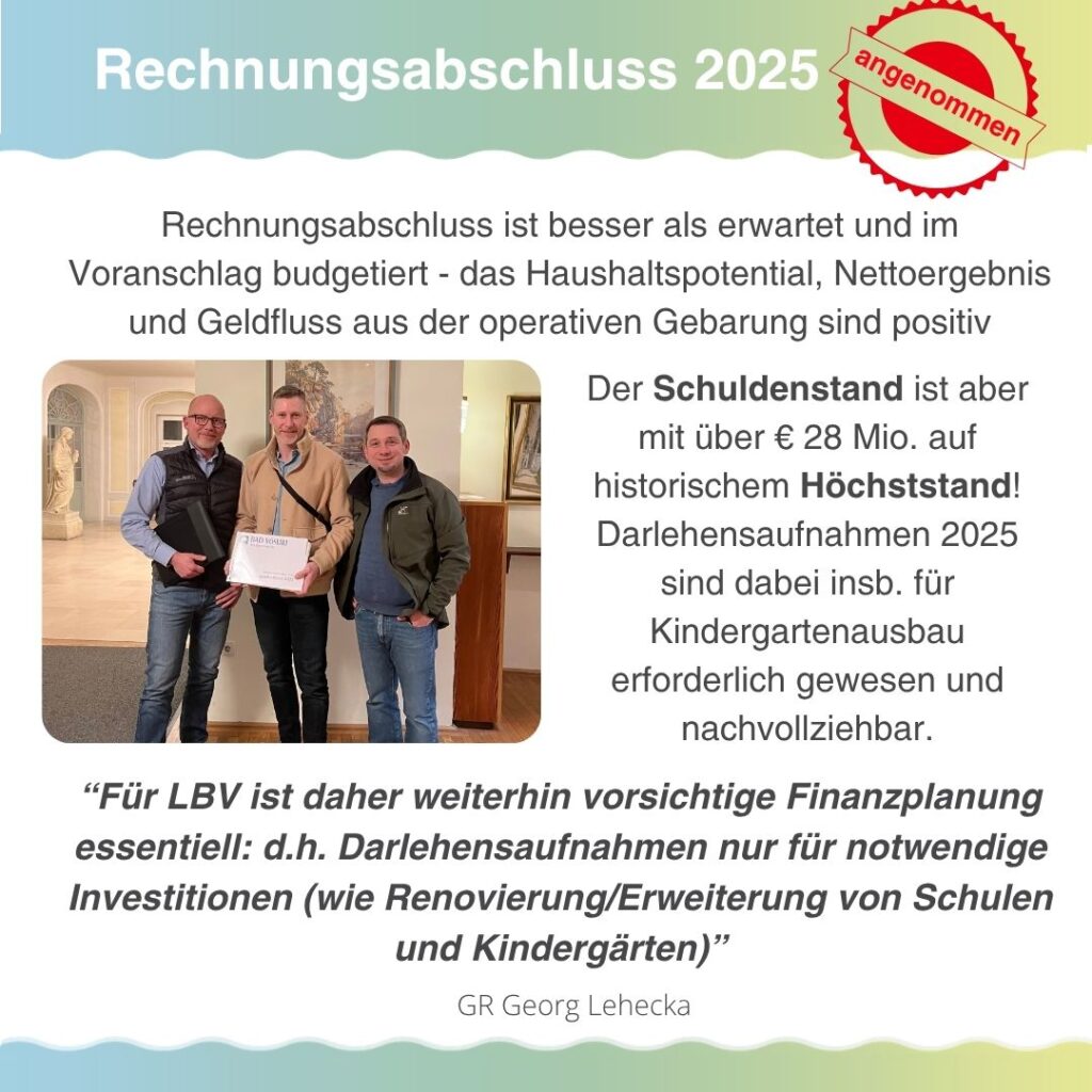 - Schuldenstand ist aber mit über € 28 Mio. auf historischem Höchststand! Darlehensaufnahmen 2025 sind dabei insb. für Kindergartenausbau erforderlich gewesen und nachvollziehbar.