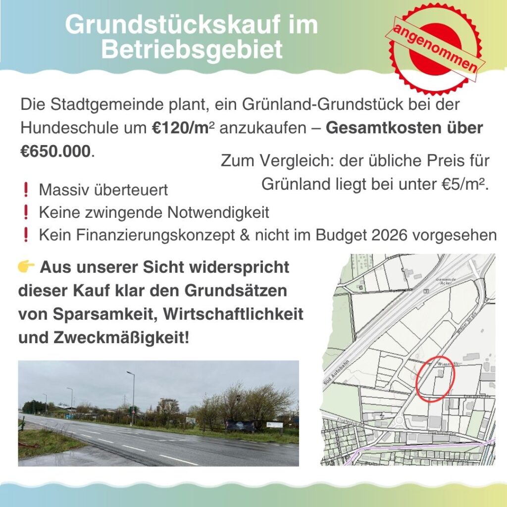 Stadtgemeinde möchte das Areal der Hundeschule unweit des Altstoffsammelzentrums, mit Widmung Grünland, um € 120 / m2 anzukaufen, um strategisch dorthin den Bauhof zu verlegen. Insgesamt würde es über € 650.000 der Stadtgemeinde kosten. .