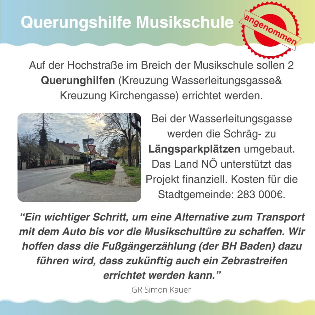 Als LBV haben wir für diese Maßnahme gestimmt, da die Schaffung von 2 sicheren Möglichkeiten für Kinder die Straße zu queren ein wichtiger Schritt ist, um eine Alternative zum Transport mit dem Auto bis vor die Musikschultüre zu schaffen.